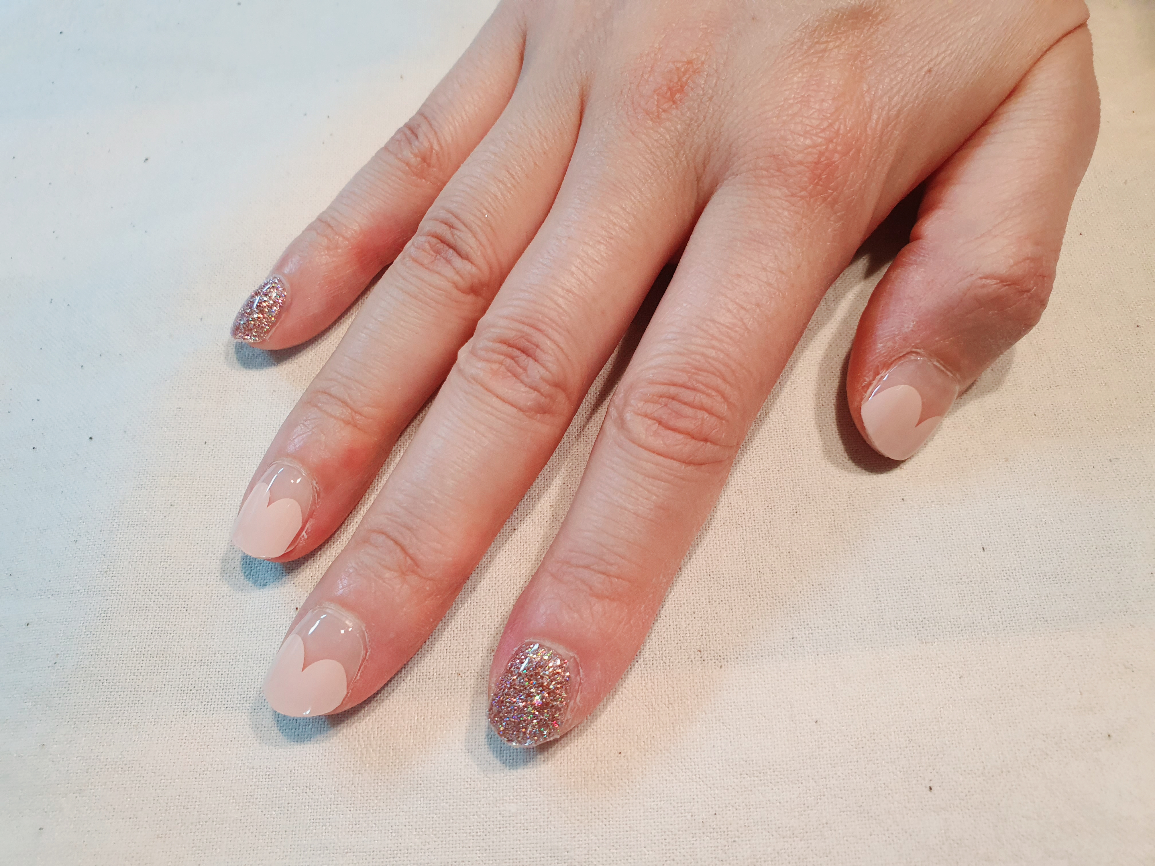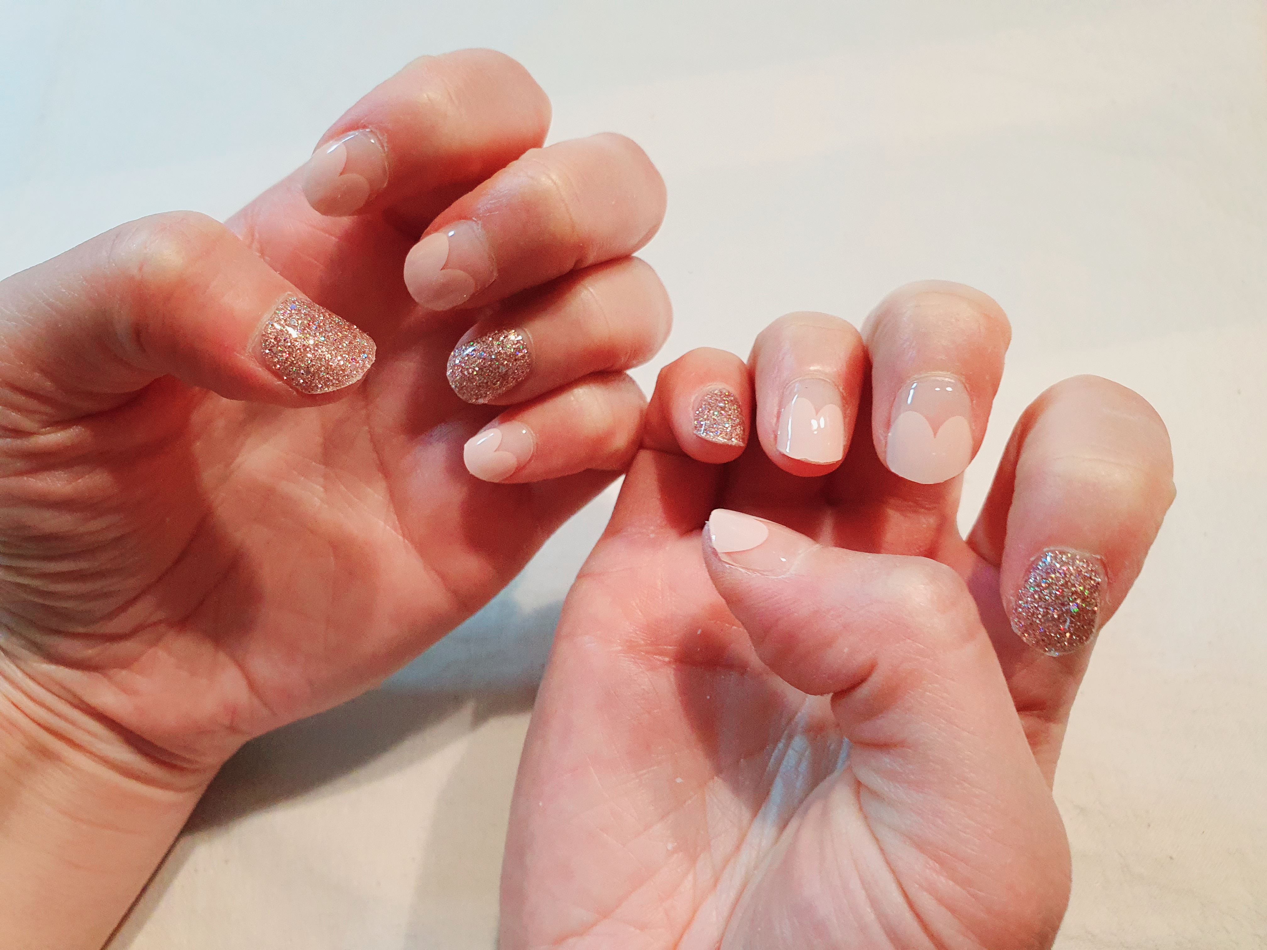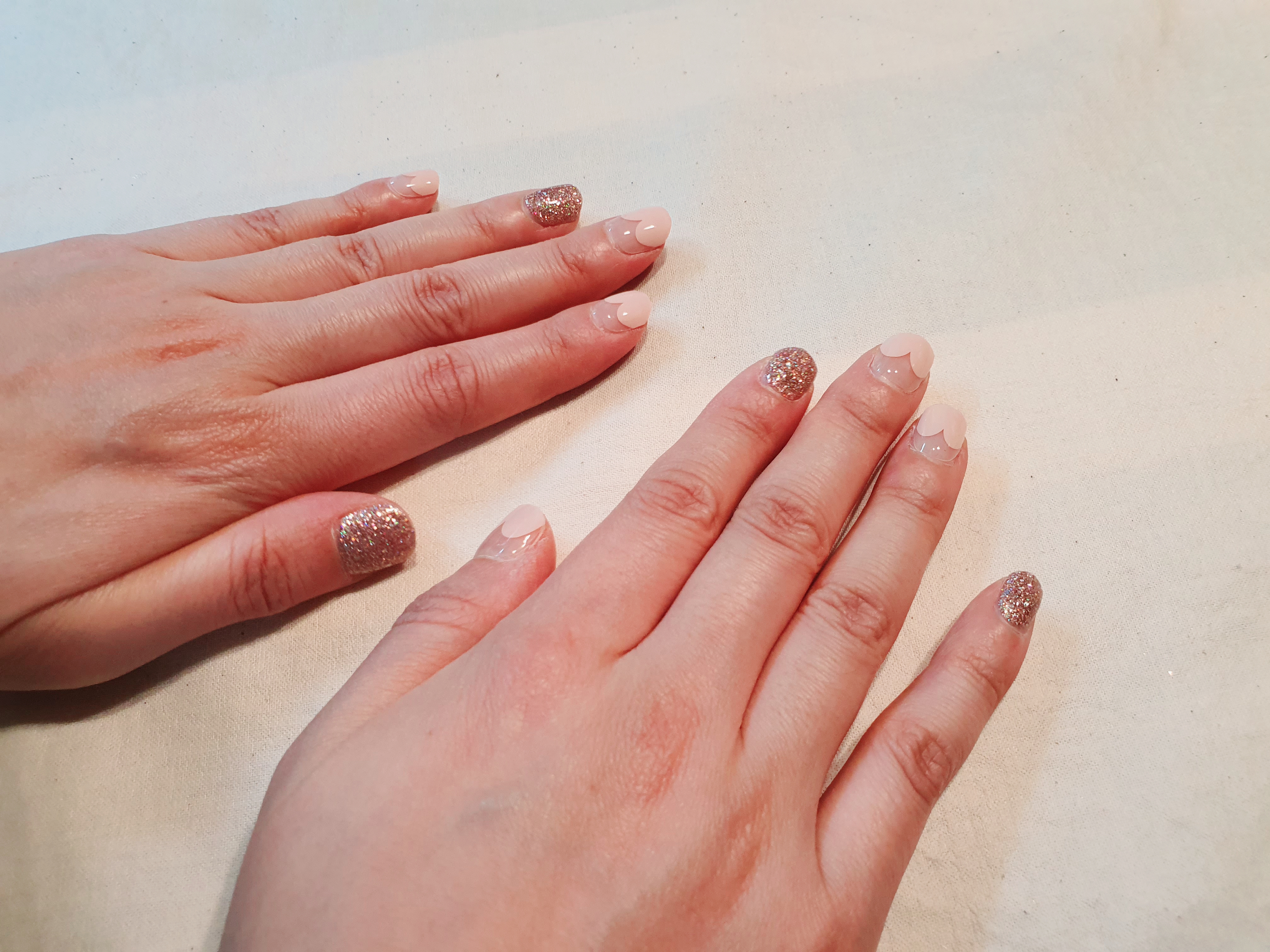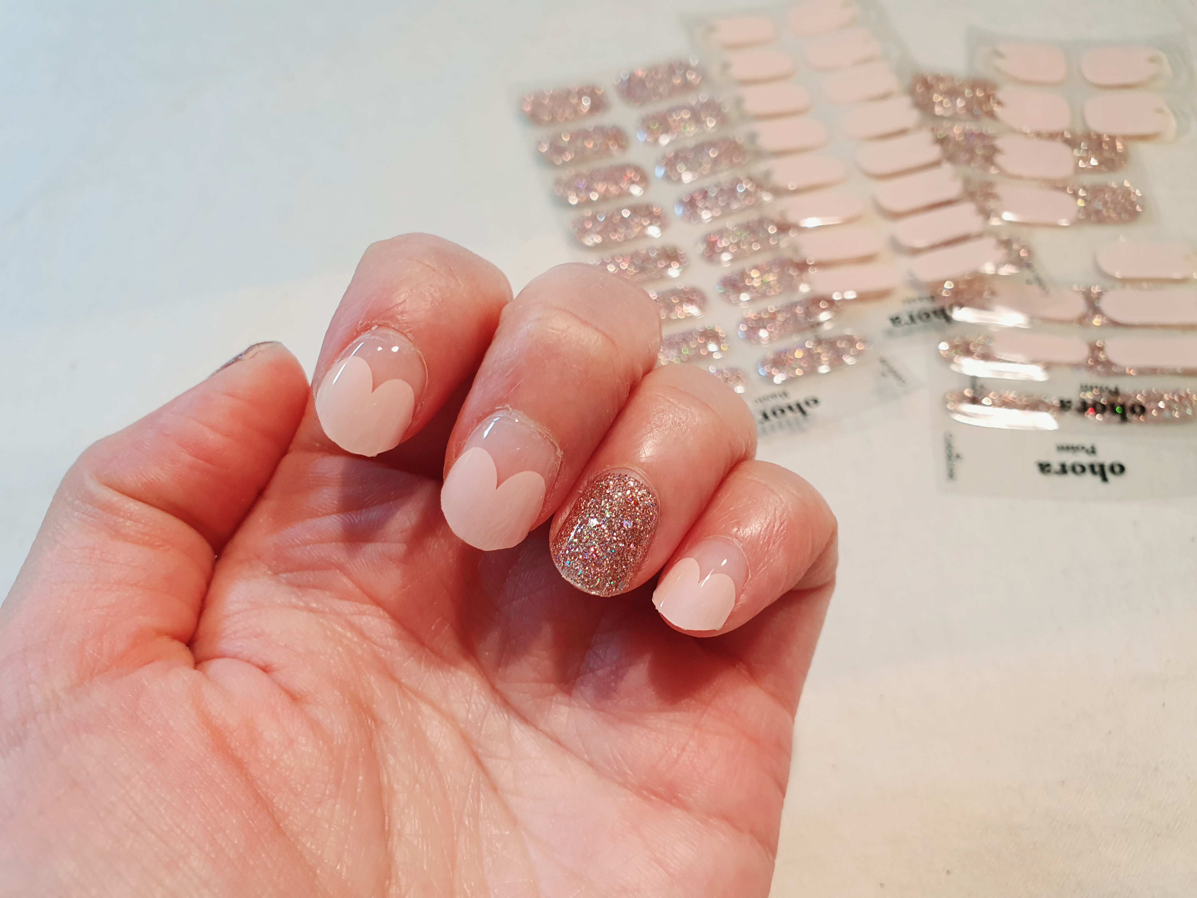 아무쪼록 위의 이유로 한동안 끊고 있던 젤네일을 오호라로 다시 시작하게 되었습니다. 첫 주문 했을 때 주문했던 네일 디자인은 찍어놓지 않아서 아래는 최근에 새로운 디자인이 나온겸 주문한 디자인이예요! 오른쪽은 하트 프렌치인데 요즘이 벚꽃 시즌이라 색깔도 봄 색깔이여서 주문했고, 왼쪽은 글리터 디자인인데 포토 후기가 정말 예뻐서 다른 디자인에 믹스해서 사용하기 위해 주문했습니다.