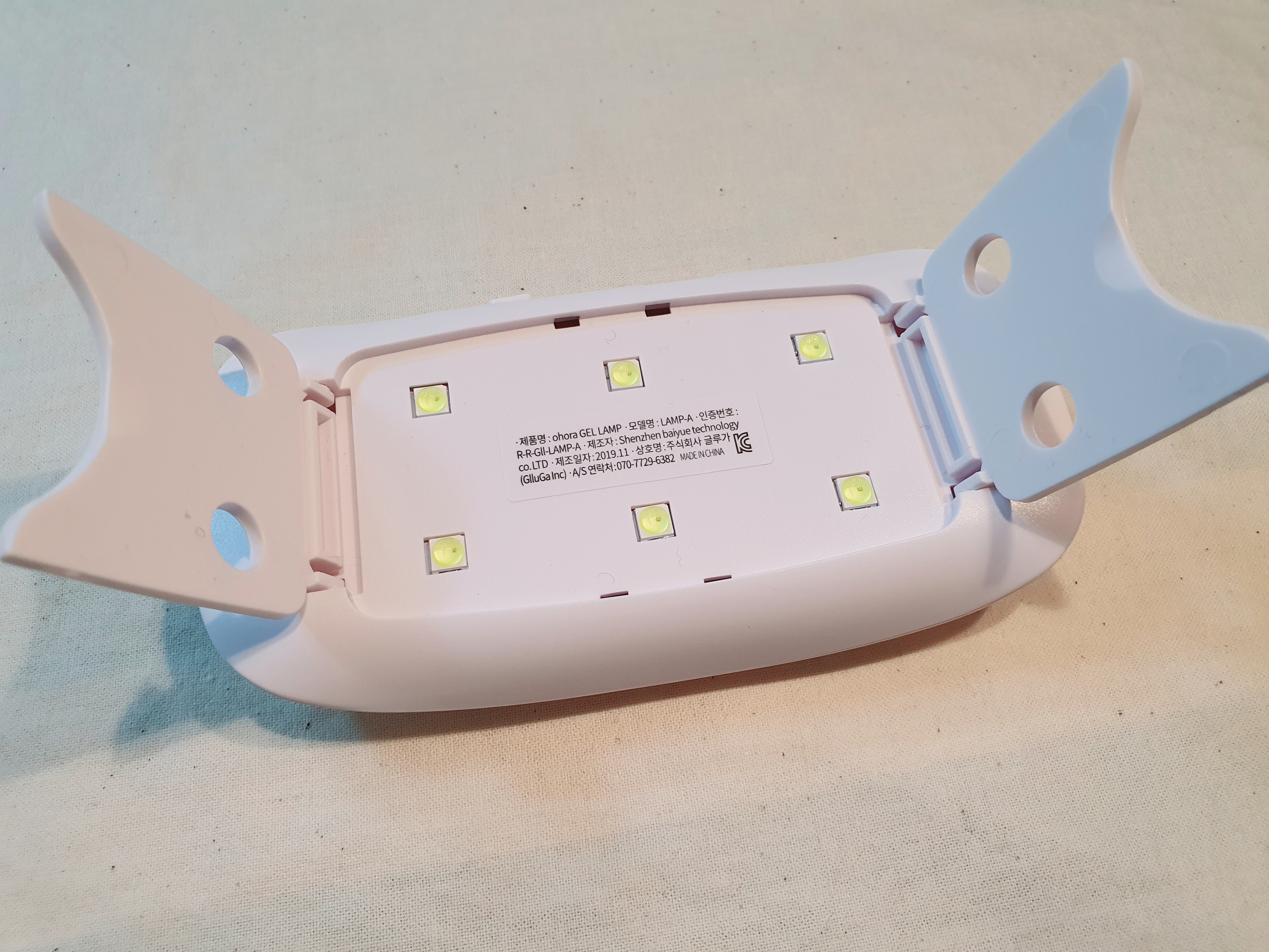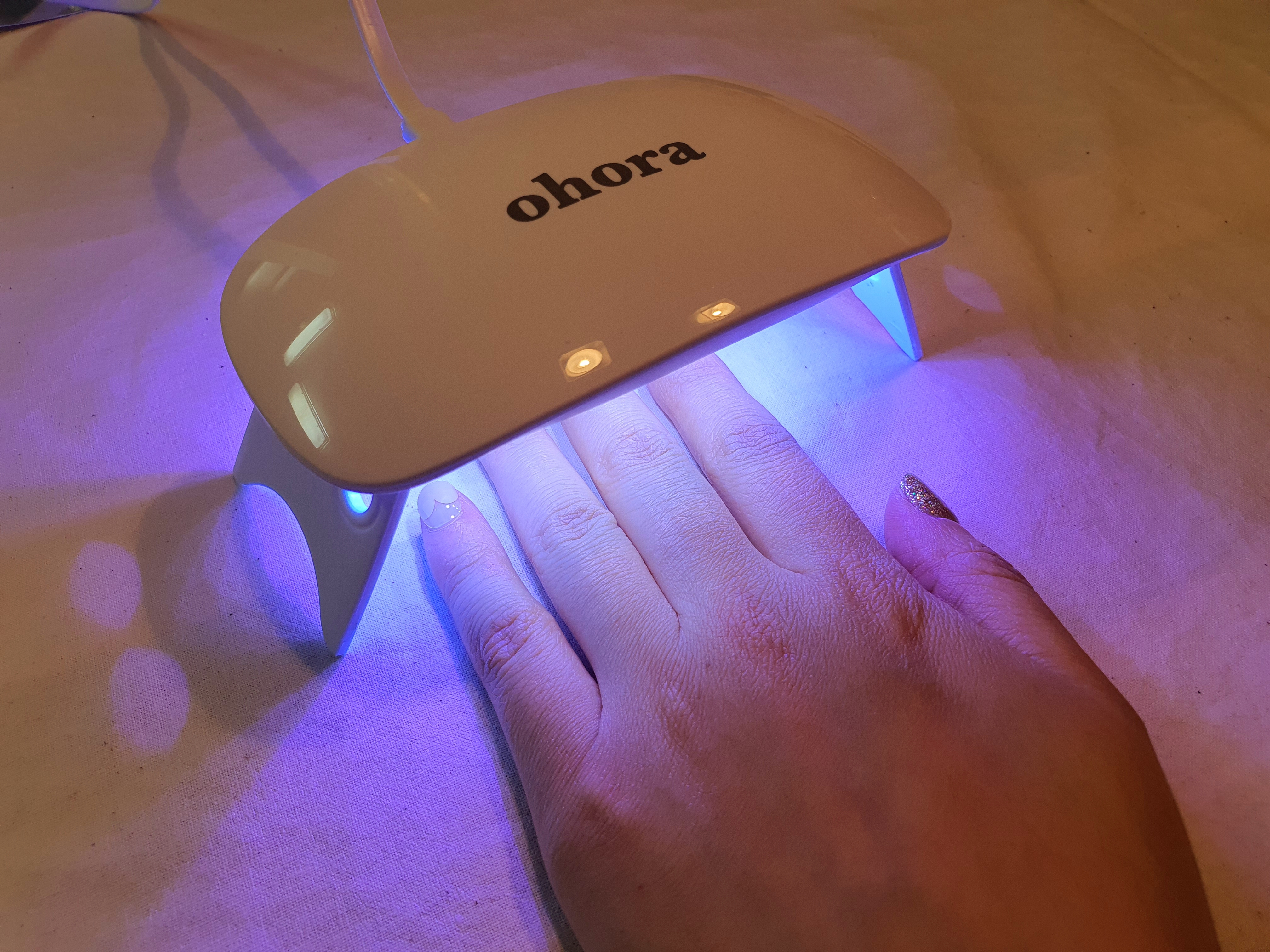 마지막으로 젤을 굽혀야겠죠? 젤램프를 켜고 구워주는데 3~4번정도 굽는 것이 유지력과 반짝임을 높이는 방법이라고 해서 전 4번을 굽고 있어요. 한번 구울 때마다 약 30초 정도 걸리는 것 같습니다.