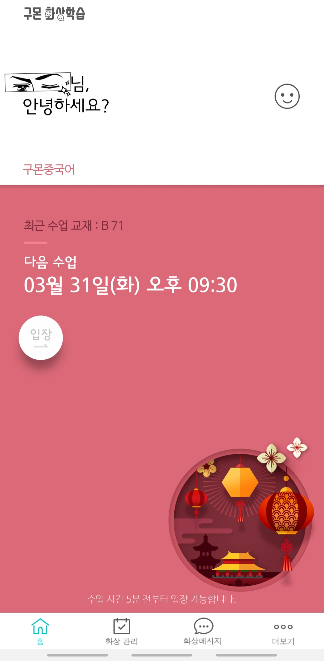 - 화상 학습: 현재 제가 하고 있는 방법으로, 매주 동일한 요일, 시간에 화상 학습이 15분간 진행됩니다. 구몬 화상 학습이라는 앱을 통해서 얼굴을 보고 수업을 할 수 있습니다. (이 방법은 중국어, 일본어에 한정된다고 해요!)